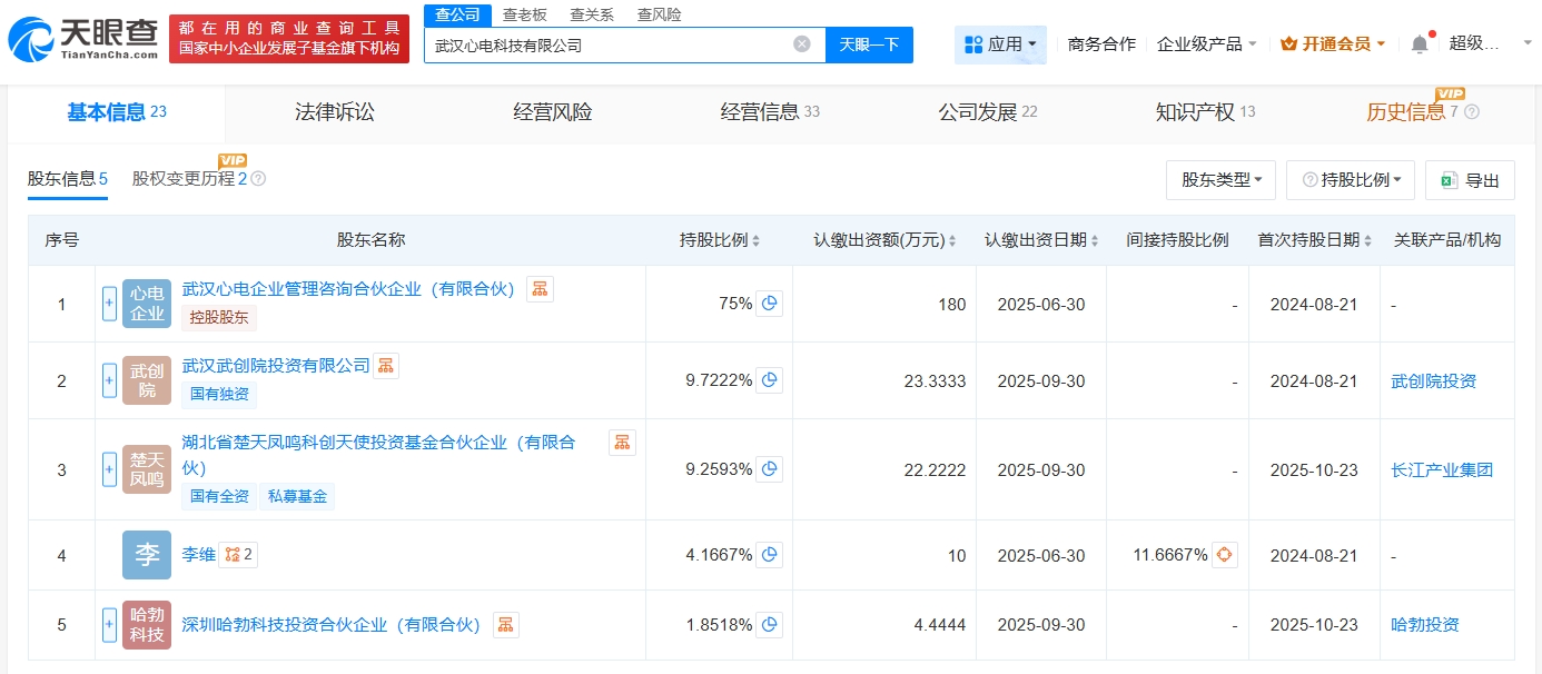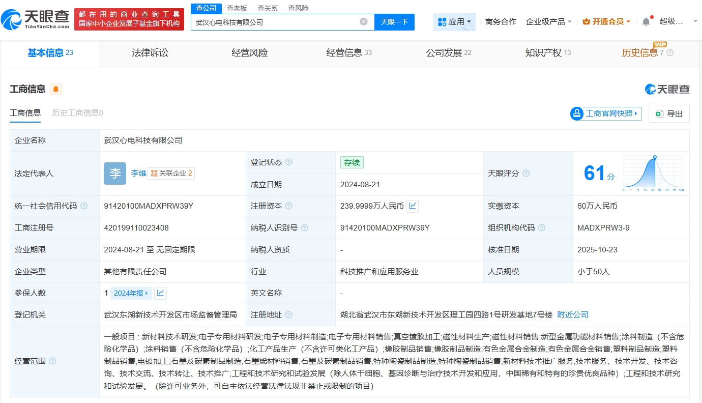 武汉心电科技有限公司成立于2024年8月,法定代表人为李维,经营范围包括新材料技术研发、电子专用材料研发、电子专用材料制造等。股东信息显示,该公司现由武汉心电企业管理咨询合伙企业(有限合伙)及上述新增股东等共同持股。