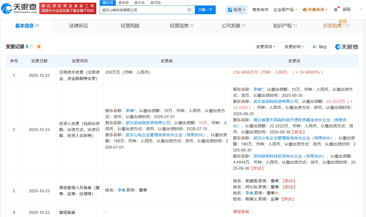 天眼查App显示,近日,武汉心电科技有限公司发生工商变更,新增华为旗下深圳哈勃科技投资合伙企业(有限合伙)、湖北省楚天凤鸣科创天使投资基金合伙企业(有限合伙)为股东南平期货配资,注册资本由200万人民币增至约240万人民币,同时新增多位高管。